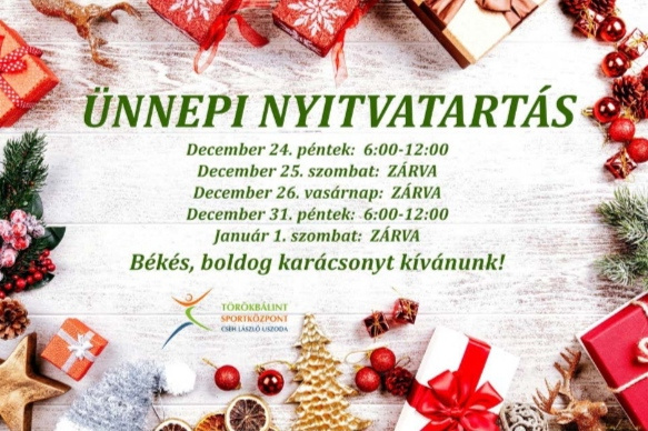 TörökbálintSport2021. december 17. 16:15erdmost.huÍgy lesz nyitva az ünnepekkor aTörökbálint SportközpontA Törökbálint Sportközpont december 25-én, 26-án és január 1-én zárva tart. December 24-én és 31-én 6:00 és 16:00 óra között lesz nyitva.