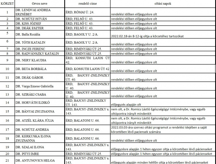 Érdemes ugyanakkor az oltás felvételét tervezőknek áttekinteniük az alább közölt táblázatot, mert januártól a háziorvosok többsége nem adott napokon, hanem többnyire rendelési időben - vagy a rendelés előtt, esetleg a végén – előjegyzés után olt. Az orvosok visszajelzései alapján ez főleg azért van, mert a pácienseik nagy többsége felvette már a vakcinát, városunk lakóinak átoltottsága magas, nincs akkora jelentkezés, hogy külön napokat kelljen kijelölni az érdeklődők számára. Az előjegyzés pedig azért szükséges, mert nem akarják, hogy az oltóanyag kárba vészen.