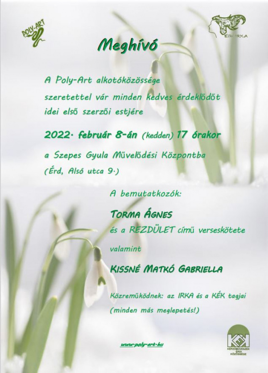 Idén szeretnék folytatni jól bevált programjaikat, köztük a szerzői esteket. Legközelebb február 8-án találkoznak, és várják a nagyközönséget a Szepes Gyula Művelődési Központban, 17 órától: „Vendégünk lesz Kissné Matkó Gabriella, a KISS Company együttes énekese. Az IRKÁ-nak vannak virtuális tagjai is, akik nem Érden élnek. Elhatároztuk, hogy idén őket is bemutatjuk: az idei első alkalommal Torma Ágnes jön el hozzánk, és a Rezdület című kötete lesz fókuszban. A rendezvényen közreműködnek az IRKA és a KÉK tagjai, és készülünk meglepetésekkel is. Azon vagyunk, hogy minden vendégünk maradandó élményekkel menjen haza.”