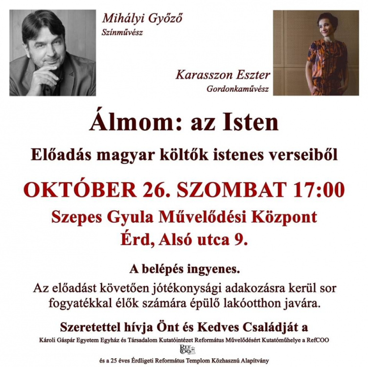 A Károli Gáspár Egyetem Egyház és Társadalom Kutatóintézet Református Művelődésért Kutatóműhelye és a 25 éves Érdligeti Református Templom Közhasznú Alapítvány jótékonysági estet szervez szombaton a Szepes Gyula Művelődési Központban. Az esten befolyó összeget a fogyatékkal élők lakóotthonának megépülésére ajánlják fel.