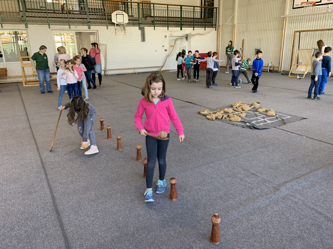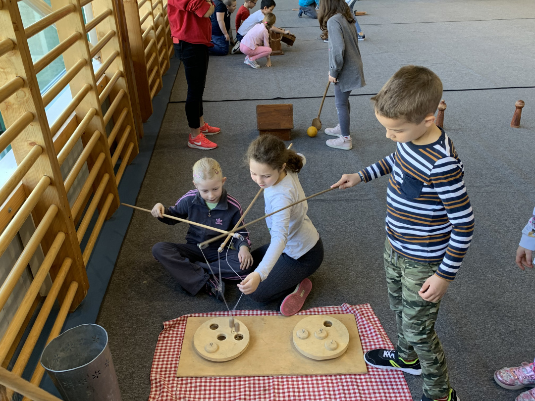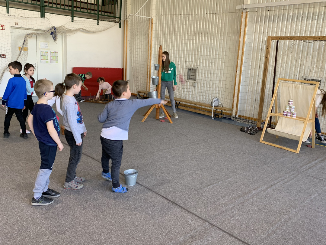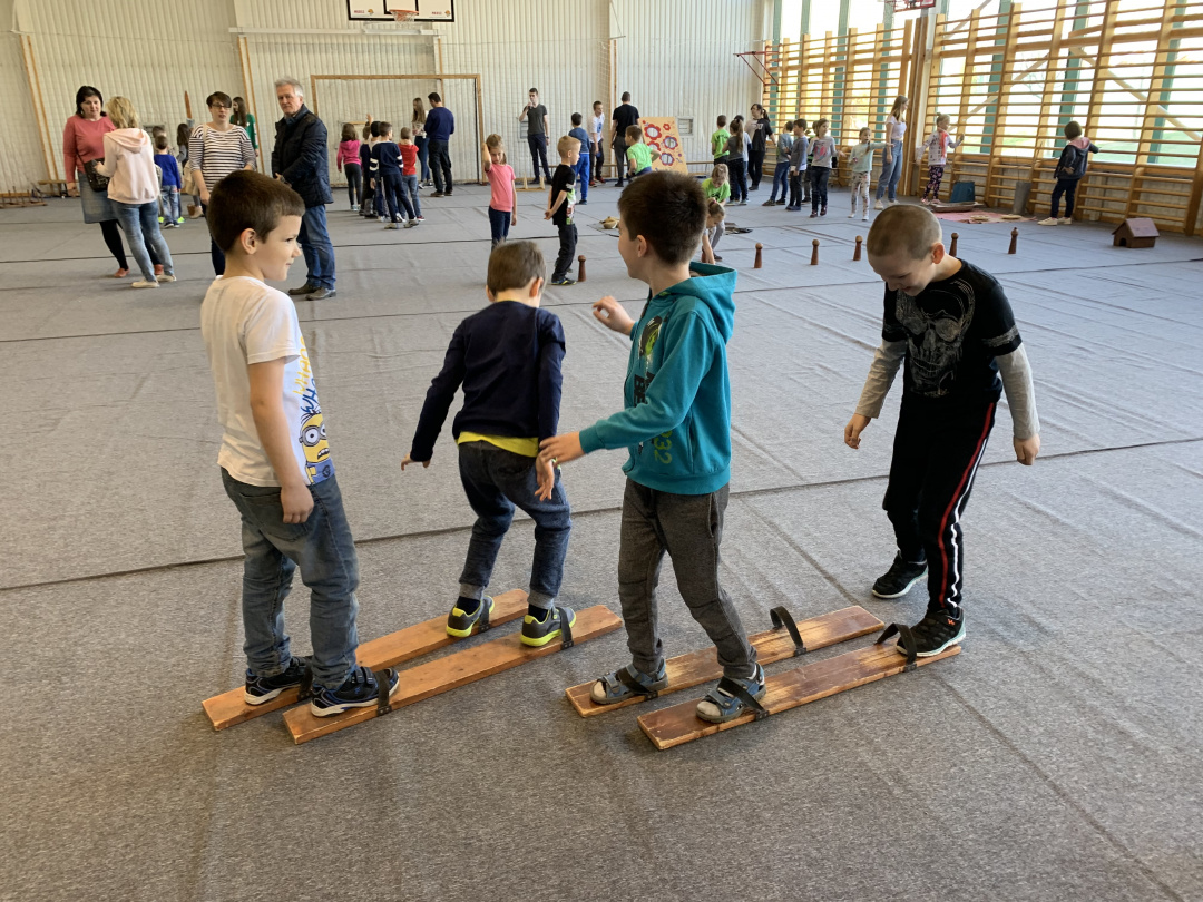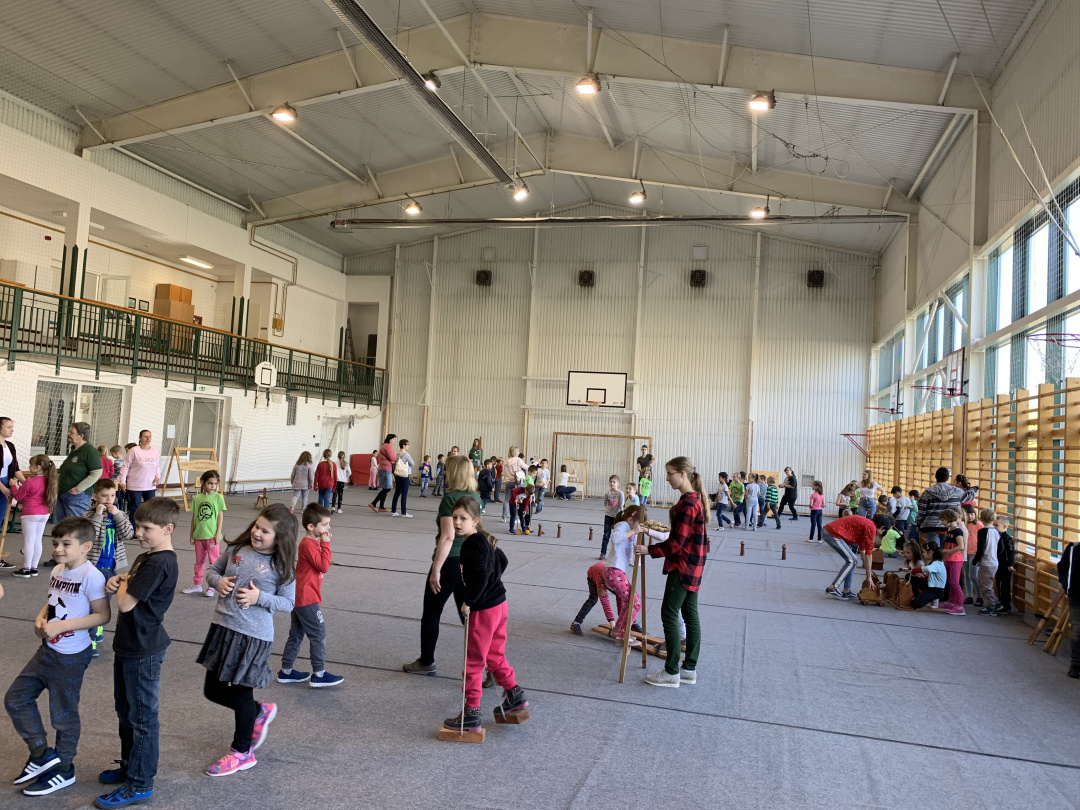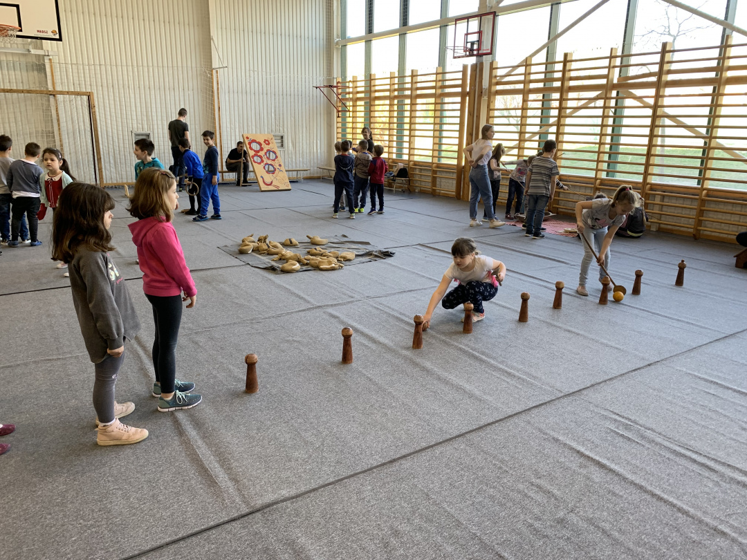 Az alsó tagozatosok az iskola tornacsarnokában hagyományőrző fajátékokkal játszhattak, melyeket az Éltető Értékeinkért Egyesület biztosított a Kőrösi napra.