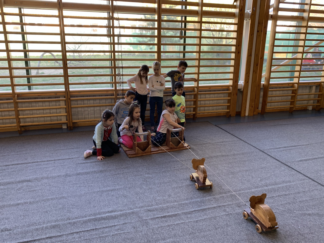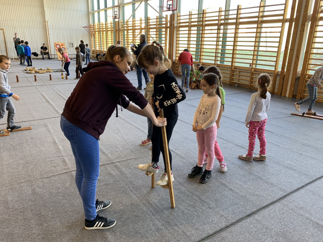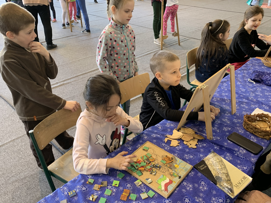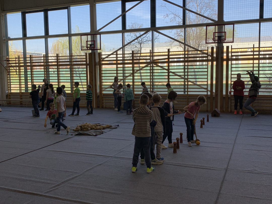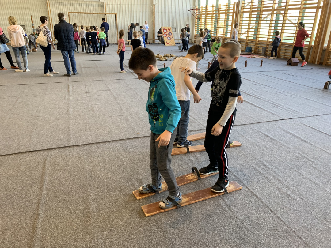 Az alsó tagozatosok az iskola tornacsarnokában hagyományőrző fajátékokkal játszhattak, melyeket az Éltető Értékeinkért Egyesület biztosított a Kőrösi napra.