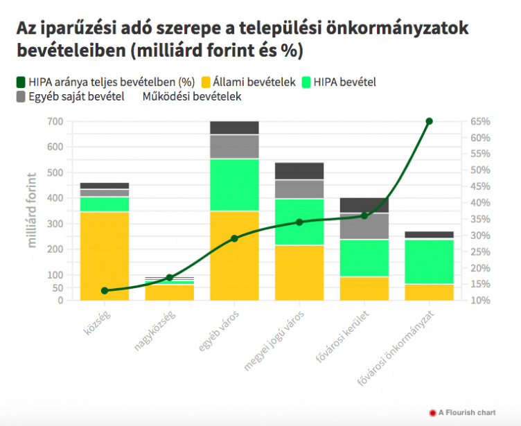 A hipa adja a települési önkormányzatok bevételeinek 32 százalékát, minden harmadik forintot. Vagyis ez az egyetlen érdemi saját bevétel. (Részletesen lásd a grafikonon!) Ráadásul az összes adóbevétel majd’ 80 százaléka a hipa! (A gépjárműadót már korábban elvette a kormány a koronavírusra hivatkozva, az idegenforgalmi adót pedig az eltűnő turizmus vitte el. Igaz, ez utóbbit a kormány 2020-ban kifizette, de nem tudni, idén hogy fogja gondolni. A nagyobb települések jelentős bevételei közé tartozott még a parkolási díj is, ám azután, hogy a kormány a veszélyhelyzet miatt ingyenessé tette a parkolást, összesen körülbelül évi 20 milliárdtól estek el.)