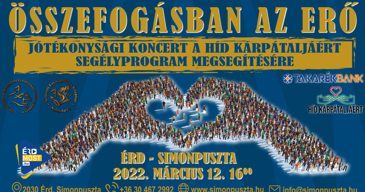 A szomszédunkban háború van! Menekültek ezrei érkeznek naponta hazánkba, menedéket és nyugalmat keresve, akik segítségre szorulnak. Március 12-én 16 órai kezdéssel „ÖSSZEFOGÁSBAN az ERŐ” ingyenes jótékonysági gálakoncertet rendeznek Simonpusztán a Szőcs Géza Nemzeti Lovaskultúra Központban. A helyszínen egész délután 14 órától este 21 óráig lehet adományozni. Az adományok továbbításáról a HÍD KÁRPÁTALJÁÉRT segélyprogramhoz a Takarékbank gondoskodik.