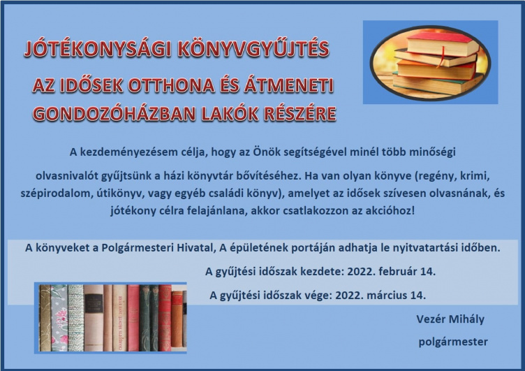 A polgármester kéri mindazokat, akik szívesen ajánlanának fel egy-egy könyvet e nemes célra, hogy adományukkal járuljanak hozzá a könyvtár létrehozásához. Mint írja, a vírus miatt egy ideig pihentetik a könyveket, amelyeket egy későbbi időpontban szállítanak majd ki. A könyvtár bővítéséhez könyvespolcot is készíttetnek, valamint a Hamvas Béla Városi Könyvtár közreműködésével a könyvek katalogizálását is megoldják, segítve ezzel a ház lakóit az olvasnivalók közötti eligazításban.