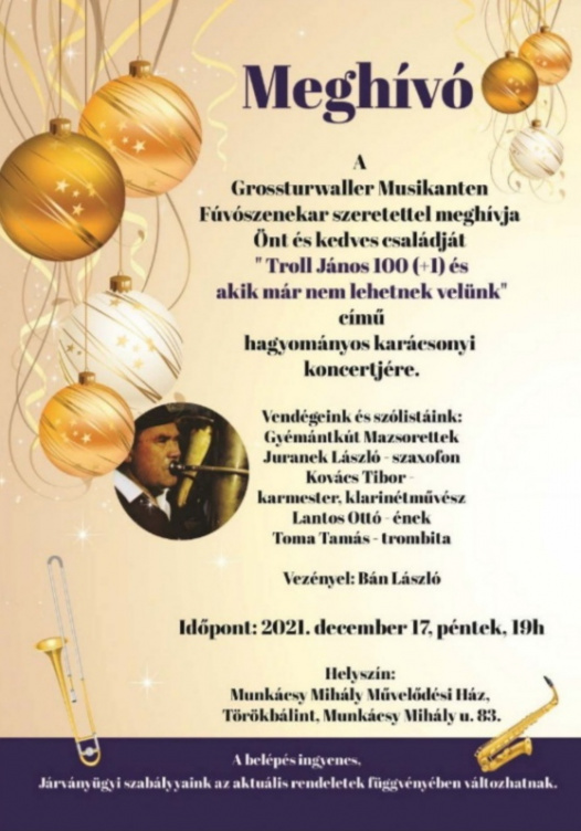 A Grossturwaller Musikanten Fúvószenekar szeretettel meghívja Önt és kedves családját „Troll János 100 (+1) és akik már nem lehetnek velünk” című hagyományos karácsonyi koncertjére. Az ingyenes eseményt a Munkácsy Mihály Művelődési Házban tartják december 17-én, 19 órakor.