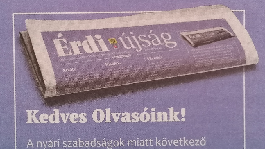 A nyári szabadságok miatt következő számunk augusztus 11-én jelenik meg. A legfontosabb híreket addig is megtalálják az erdmost.hu oldalon, illetve hallgassák az ÉrdFM 101.3-at. Köszönjük a türelmet, hamarosan ismét jövünk. Üdvözlettel: Érdi Újság szerkesztősége