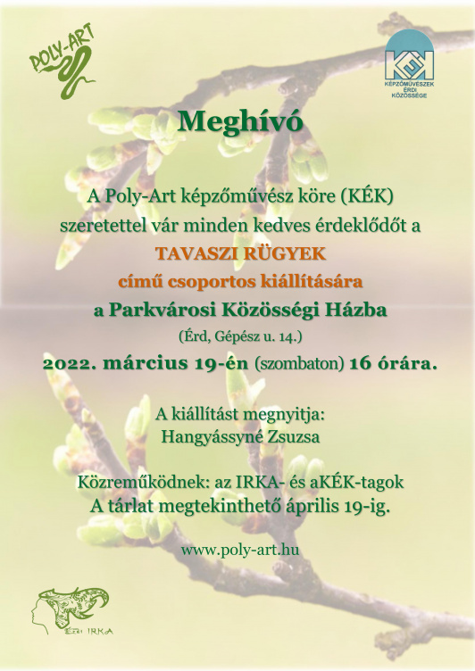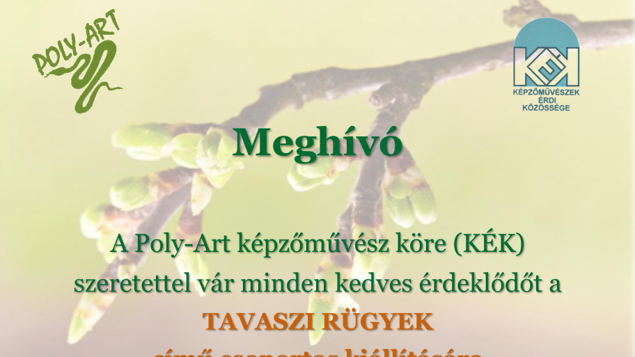 A Poly-Art képzőművész köre (KÉK) szeretettel vár minden érdeklődőt a Tavaszi rügyek című csoportos kiállítására a Parkvárosi Közösségi Házba (Érd, Gépész u. 14.) március 19-én (szombaton) 16 órára. A tárlaton festmények és kerámiák egyaránt szerepelnek majd.