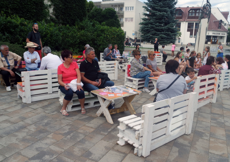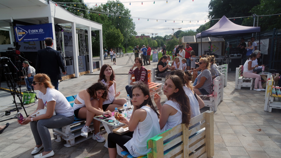 Most, hogy végre van a főtéren egy kis élet, felmerül bennem a kérdés: miért nem volt itt eddig semmi? - nézett körbe mosolyogva egy anyuka, aki a kislányával üldögélt az egyik asztal mellett. Tényleg, csodálkoztam rá magam is, mennyit dob az amúgy esztétikus és kellemes, de valahogy csupasz főtéren az a pár raklapbútor, no meg az, hogy emberek ültek rajtuk, nemcsak arra a rövid időre, míg a gyerek átvág a téren a gördeszkával, nem egymástól elkülönülve a távoli padokon, hanem az együttlét, a szórakozás kedvéért (nem mellesleg zene mellett és ínycsiklandó illatok közepette).