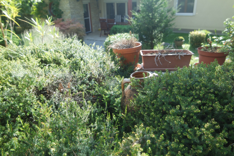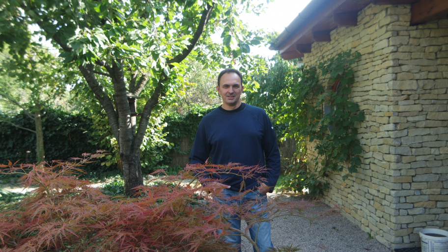 „2008-ban költöztünk ide a feleségemmel és a két gyerekemmel Budapestről. Ez volt a negyvenedik ház; valamikor január elsején hirdették meg, fénykép nélkül, pár szóban. Mintha el sem akarták volna adni. Már kifogytunk a címekből, azt mondtuk, nézzük meg ezt is, mintha Isten is úgy akarta volna, hogy a miénk legyen” – mesélte Zsolt, miközben végigvezetett a kerten, amit egy még korábbi tulajdonos alakított ki 2000 környékén. „A keleti vallások híve volt, ezért ilyen az elrendezése. Sokkal dúsabb volt a növényzet, mint most, mikor először kiléptem a teraszra, az eget nem lehetett látni. Így aztán megritkítottuk. Nagyon sok óra munkám van benne” – mondta Zsolt, miközben arrébb sétáltunk a melléképületig. Előtte kis terasz, kőfalát benövi az erika, ami télen hozza virágait.