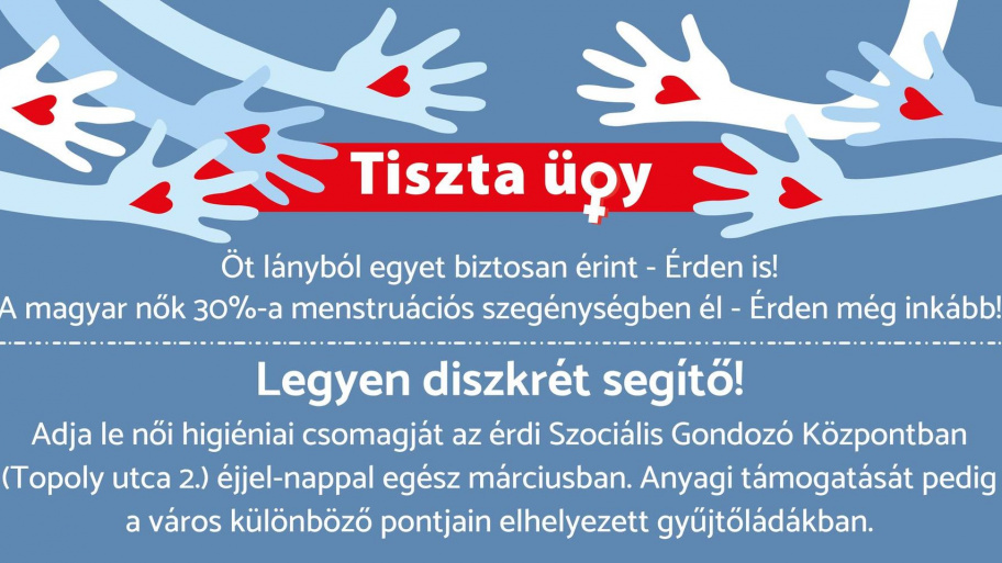 Márciusban egész hónapban várja az adományokat a Szociális Gondozó Központ a menstruációs szegénységben élő nők megsegítésére, melyhez csupán egy táskányi női higiéniai csomagot kell összeállítanunk, de a város négy pontján kihelyezett perselyekbe pénzadomány is helyezhető.
