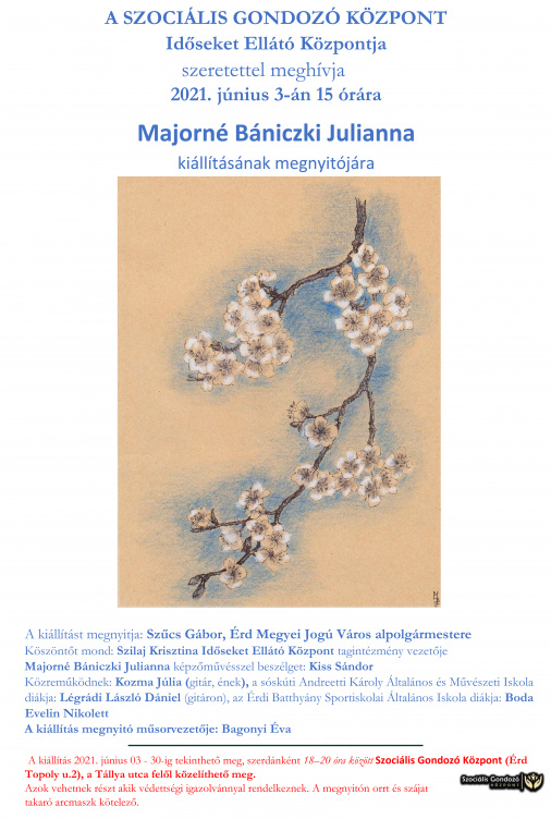A kiállítást a Topoly utcai Időseket Ellátó Központban június 3-án 15 órakor nyitja meg Szűcs Gábor alpolgármester, köszöntőt mond Szilaj Krisztina tagintézmény-vezető. Majorné Bániczki Julianna képzőművésszel Kiss Sándor beszélget majd. Közreműködnek: Kozma Júlia (gitár, ének), Légrádi László Dániel (gitár), a sóskúti Andreetti Károly Általános és Művészeti Iskola diákja, valamint Boda Evelin Nikolett, az Érdi Batthyány Sportiskolai Általános Iskola diákja. A rendezvény műsorvezetője Bagonyi Éva.