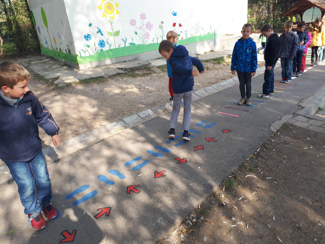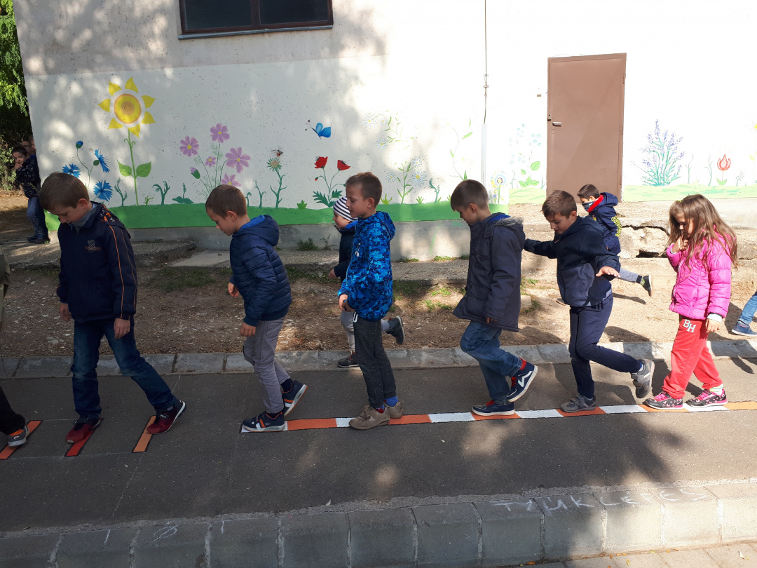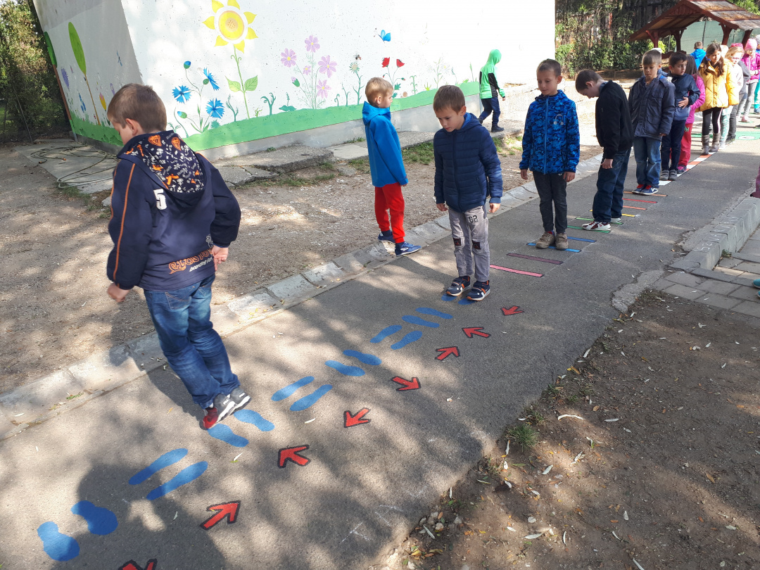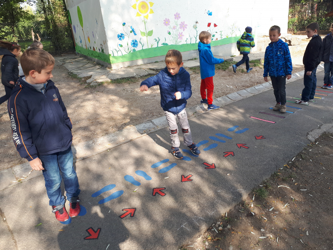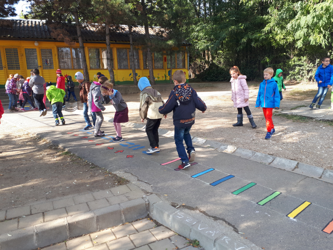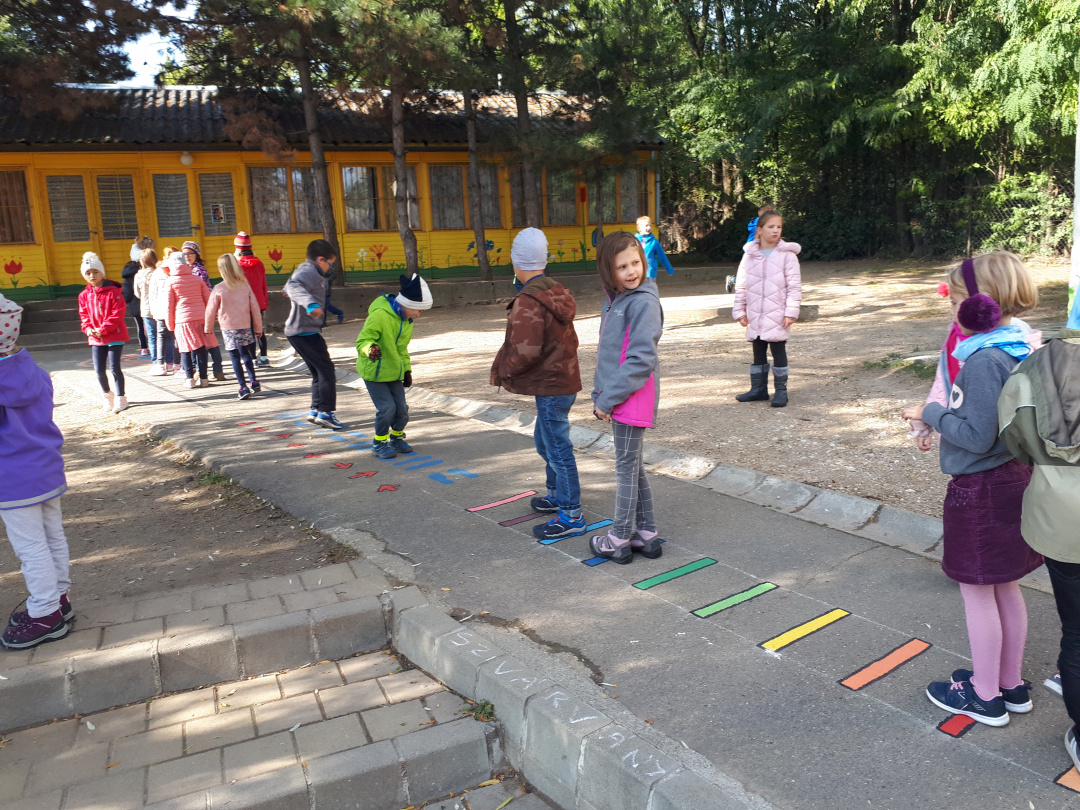 - Az ötletet sok-sok tervezés, internetről inspirálódás követte, így született meg ez a mostani projekt is. Olyan akadálypályát terveztünk, ami az első-másodikos korosztály számára fontos mozgásokat gyakoroltatja (tyúklépés, békaugrás, oldalazó lépés, egyensúlyozás, ugrálás, útvesztő, medvejárás), de emellett olyan további játékok is színesítik majd a tanulók szabadban töltött idejét, mint az ugróiskola, körjáték, tükör játék, sakktábla.