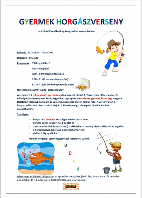 A tárnoki halastónál rendezi meg gyermek horgászversenyét vasárnap az Érd és Környéke Horgászegyesület. Már sokan jelentkeztek, de még várnak nevezőket a 3-14 évesek köréből. A verseny nem kötött egyesületi tagsághoz, csak érvényes gyermek állami jegy szükséges az induláshoz.