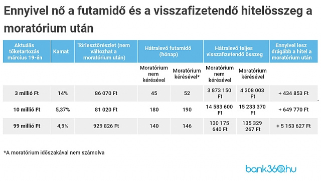 A fentebb bemutatott kalkulátor segítségével lehet kiszámolni, ahogyan azt is, hogy a moratórium idején összegyűlt kamat miatt mennyivel hosszabb futamidőre számíthatunk.