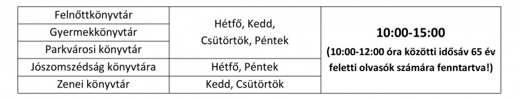 A könyvtár többi szolgáltatása (szabadpolcon történő válogatás, könyvkötészet, folyóirat kölcsönzés, helyben használat, internetezés, nyomtatás, fénymásolás, beiratkozás, előjegyezés, dokumentum foglalás és könyvtárközi kérés intézése) további értesítésig szünetel.