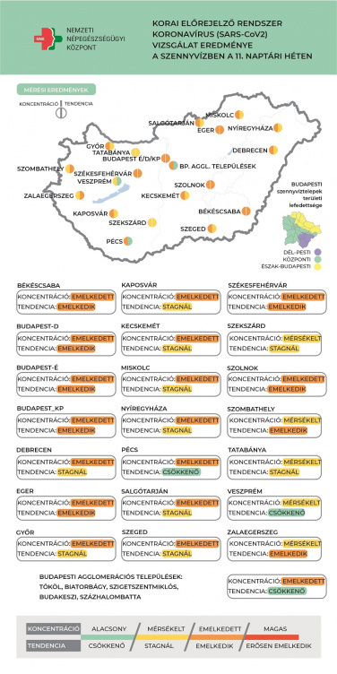 A mintavételi pontok csaknem felét stagnálás jellemzi, míg a Budapest környéki településeken (Tököl, Biatorbágy, Szigetszentmiklós, Budakeszi és Százhalombatta), Pécsett és Veszprémben tovább folytatódott a csökkenés. A szennyvizek SARS-CoV-2 örökítőanyagának koncentrációja a mintavételi helyek többségében az emelkedett tartományba esik.