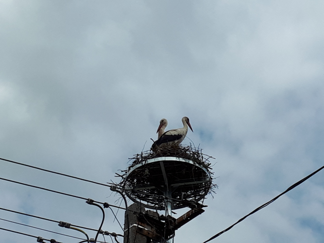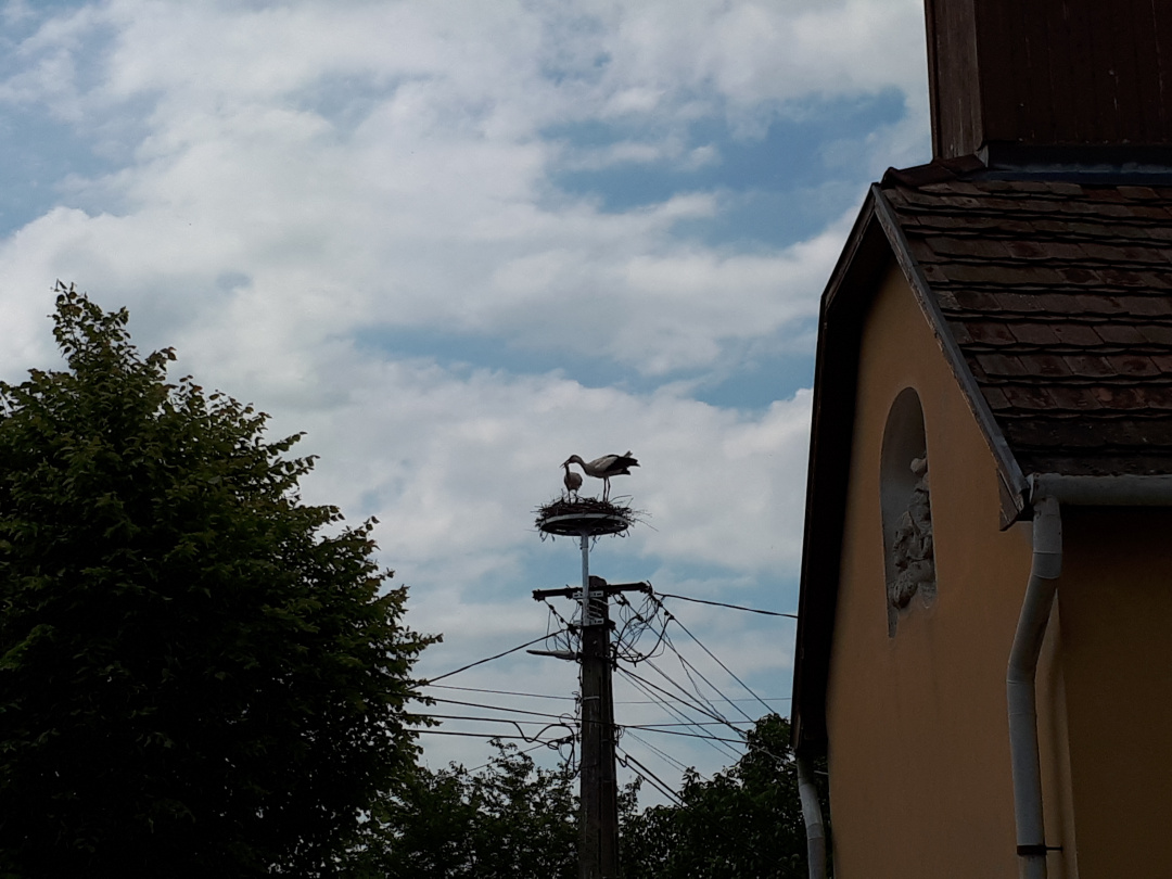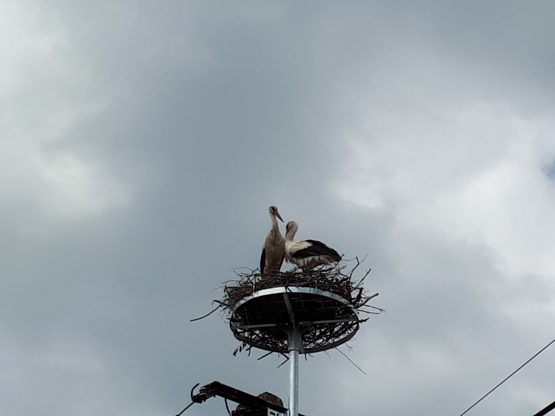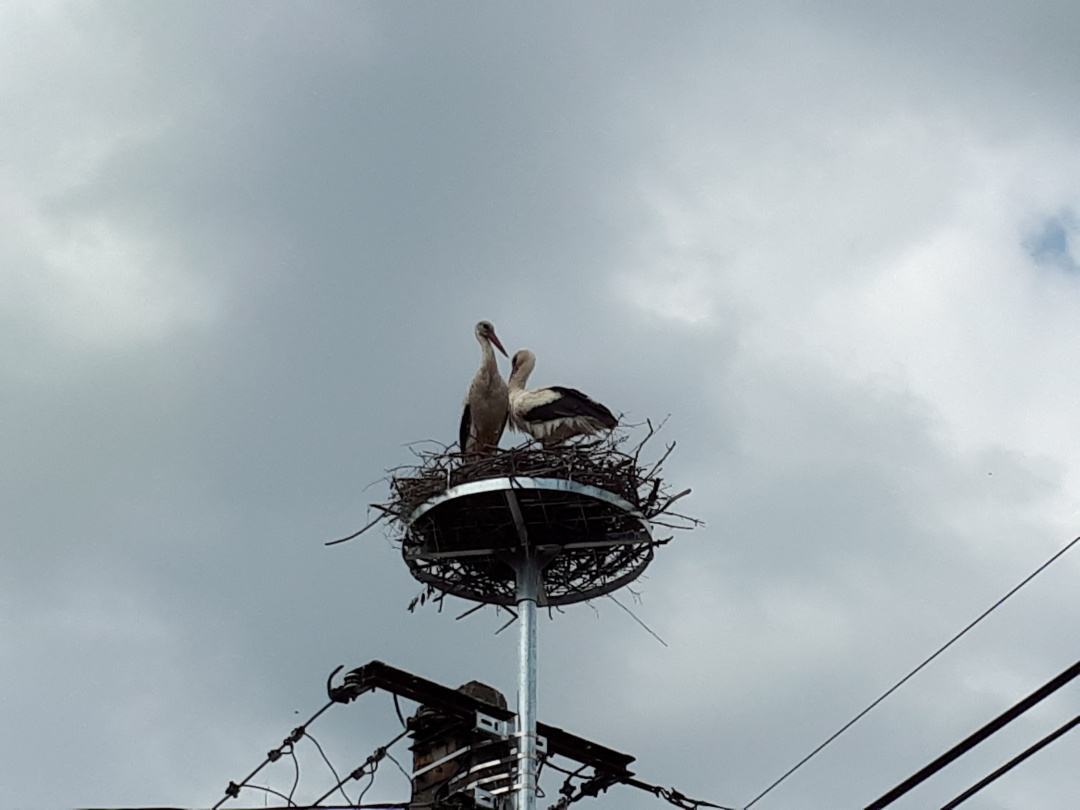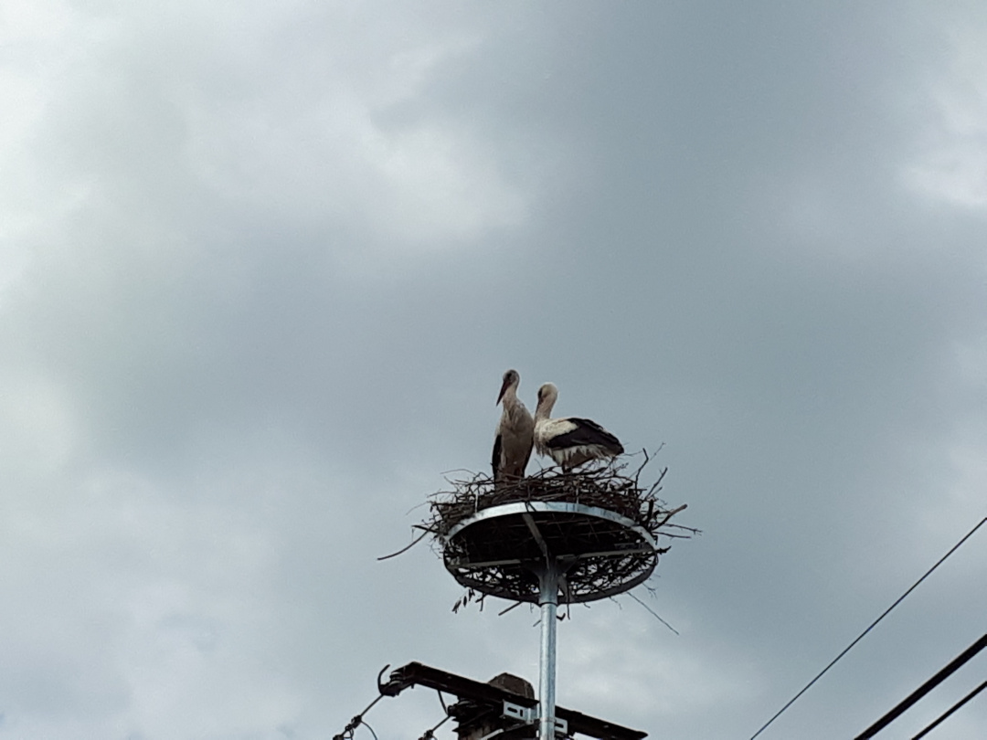 A gólyák teljesen otthonosan berendezték már a szerkezetet, mire meglátogatjuk őket Krisztával. Sőt, a vőlegény nekiáll kelepelni is, így üdvözöl minket. Kriszta aztán felhívja a figyelmemet rá, hogy az egyikük lábán gyűrű van, jó lenne kideríteni, hol kaphatta, mert ezzel valamennyire az eddigi életútját is felderíthetnénk.