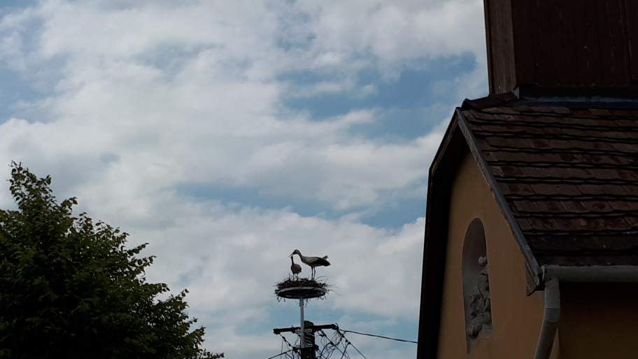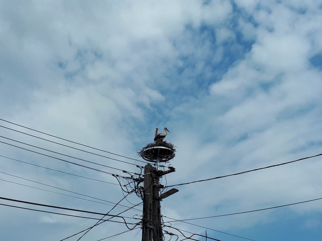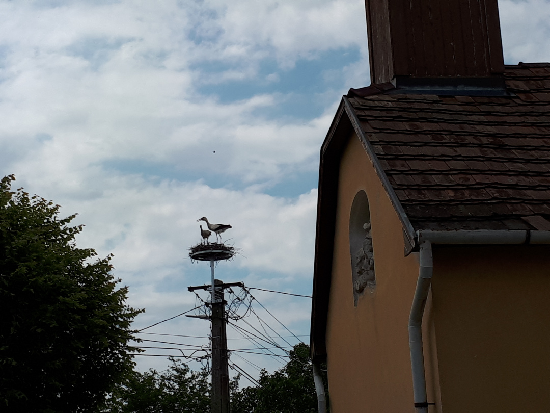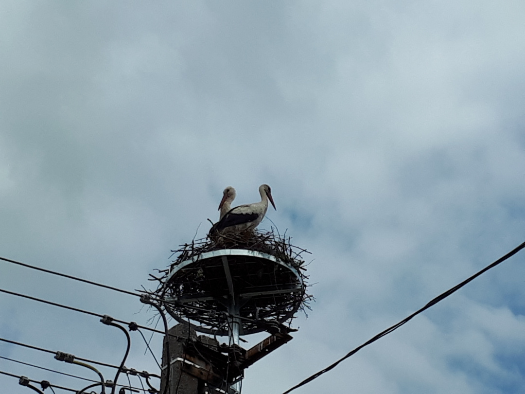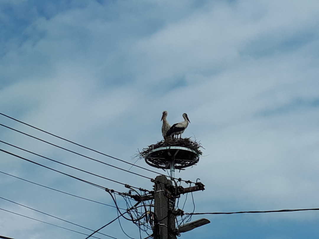 A gólyák teljesen otthonosan berendezték már a szerkezetet, mire meglátogatjuk őket Krisztával. Sőt, a vőlegény nekiáll kelepelni is, így üdvözöl minket. Kriszta aztán felhívja a figyelmemet rá, hogy az egyikük lábán gyűrű van, jó lenne kideríteni, hol kaphatta, mert ezzel valamennyire az eddigi életútját is felderíthetnénk.