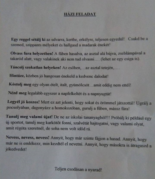 "Megragadó nyári "házi feladat" egy kedves osztályfőnöktől. A szöveg már több változatban, több osztályban is felbukkant, eredetije egy olasz pedagógustól származik. Terjedjen csak!" - ezekkel a szavakkal tette ki még pár éve dr. Vekerdy Tamás a következő képet. Terjedjen hát nálunk is!