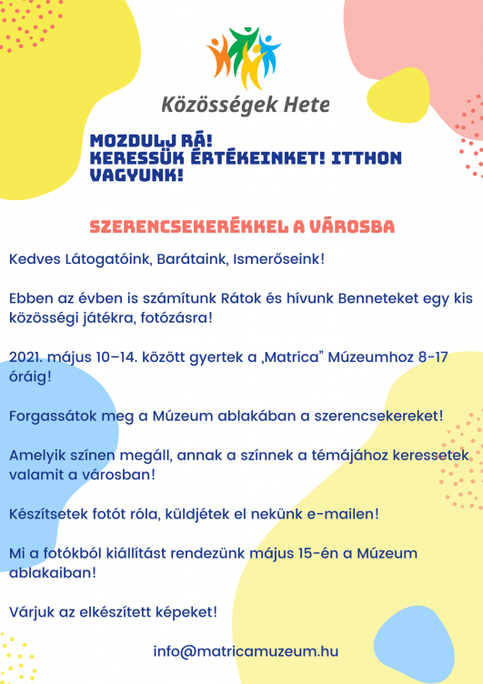 A Százhalombattai Matrica Múzeum közösségi játékra hívja a lakosokat. A játék lényege a múzeumnál található szerencsekereket megforgatva, amelyik színnél megáll a kerék, annak a színnek a témájához kell keresni valamit a városban. Az ezekről készült fotókból kiállítást is rendeznek.