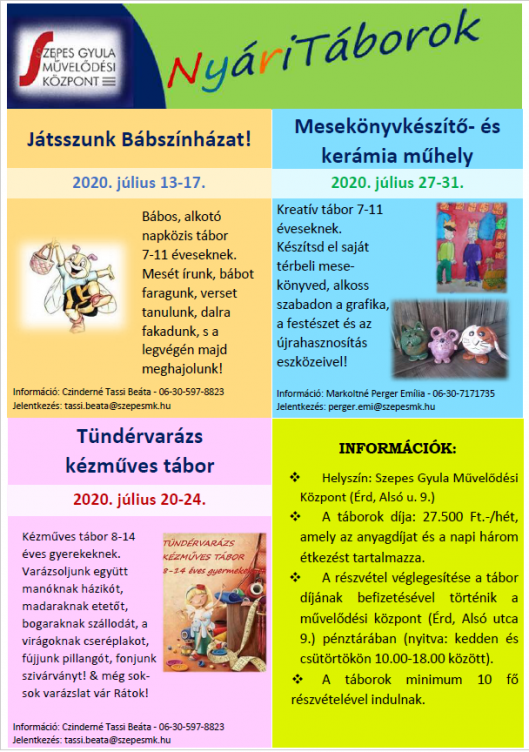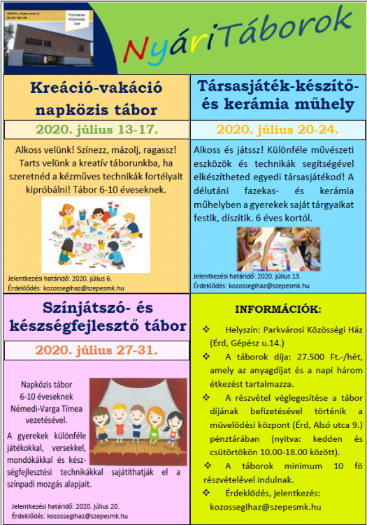 - Színjátszó- és készségfejlesztő napközis tábort tart július 27-31. között a 6-10 éveseknek Némedi-Varga Tímea, ahol a gyerekek különféle játékokkal, mondókákkal versekkel, készségfejlesztési technikákkal sajátíthatják el a színpadi mozgás és a színjátszás alapjait.