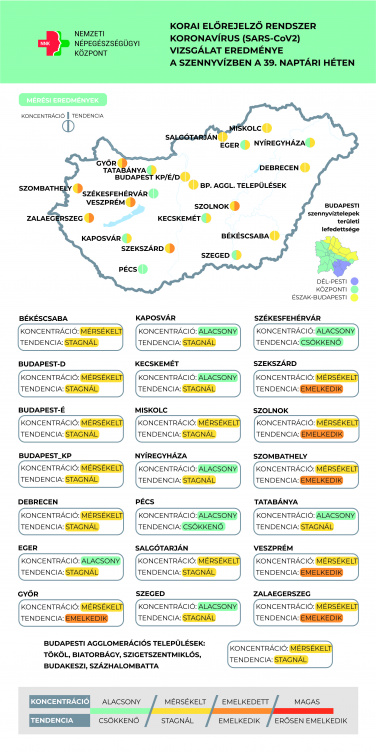 A szennyvízminták SARS-CoV-2 koncentrációja országos szinten továbbra is emelkedő tendenciát mutat. A 39. héten a vizsgált városok többségében a tendencia stagnál, de emelkedés tapasztalható Győrött, Szekszárdon, Szolnokon, Szombathelyen, Veszprémben és Zalaegerszegen, míg Pécsett és Székesfehérváron csökkenés figyelhető meg. 14 mintavételi ponton mérsékelt koronavírus koncentráció jellemző, míg 8 városban továbbra is alacsony a víruskoncentráció.