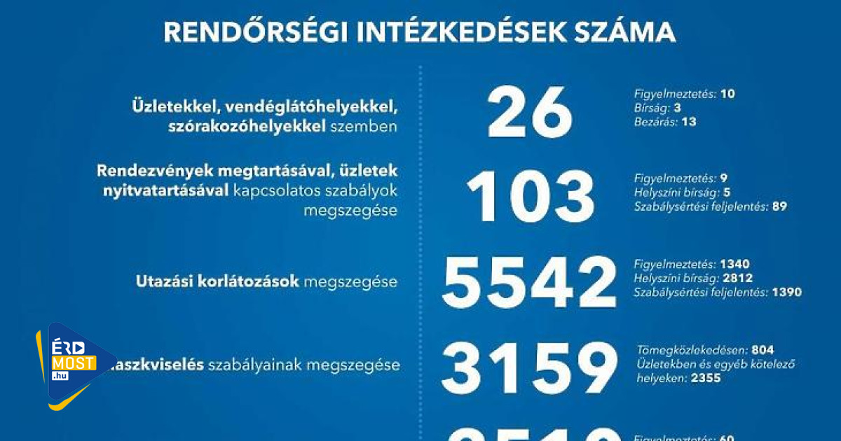 Eszerint vasárnapig 26 alkalommal intézkedtek üzletekkel, vendéglátóhelyekkel, szórakozóhelyekkel szemben a járványügyi előírások megsértése miatt. Egy nap alatt 11-el nőtt ez a szám. A rendőrség már 13 helyet be is záratott, 10 egység figyelmeztetéssel megúszta, 3 pedig bírságot kapott.