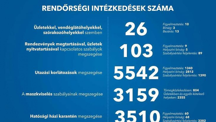 Mostanáig 5542 esetben szegték meg az utazási korlátozásokat, az esetszám csak 41-gyel nőtt egyetlen nap alatt. A maszkviselés szabályainak megsértése miatt viszont egy nap alatt 243 esetben intézkedtek, ebből csak egyetlen esetben tömegközlekedésben, minden más esetben üzletekben és egyéb kötelező helyeken. Összesen 3159 esetben intézkedett a mai napig a rendőrség a maszkviselés szabályainak megszegése miatt.