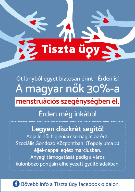 „A havi vérzés még mindig tabu, a menstruációs szegénység pedig (ami nem csupán anyagi okokra vezethető vissza), a nők 10-30 százalékát érinti. Magyarán a nők közel harmada nem tudja megvásárolni magának azokat az eszközöket, amelyekkel valóban komfortosan érezné magát a menstruáció ideje alatt. 5-10 százalékuk nem a pénz-, hanem az információhiány, vagy épp neveltetésbeli okok miatt nem tud élni ezzel a lehetőséggel” – hangsúlyozta lapunknak Gecse-Simon Orsolya, a Szociális Gondozó Központ szakmai vezetője. 2020-ban az Emma utcai telephelyükön lehetett leadni e termékeket, amelyeket folyamatosan eljuttattak az iskoláknak. Nőnapi rendezvényükön pedig mintegy 150 ezer forintot gyűjtöttek, ebből olyan dolgokat (fehérneműt, piperecikkeket) vettek, amelyekkel a bántalmazott, menekülő nőket tudták támogatni, akik gyakran egy szál ruhában hagyták hátra otthonukat.