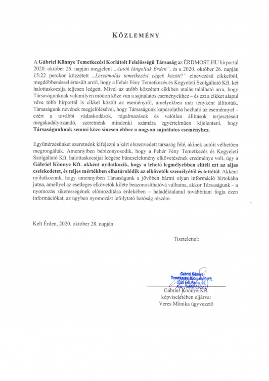 Október 28-án a Gábriel Könnye az alábbi közleményt juttatta el szerkesztőségünkbe: