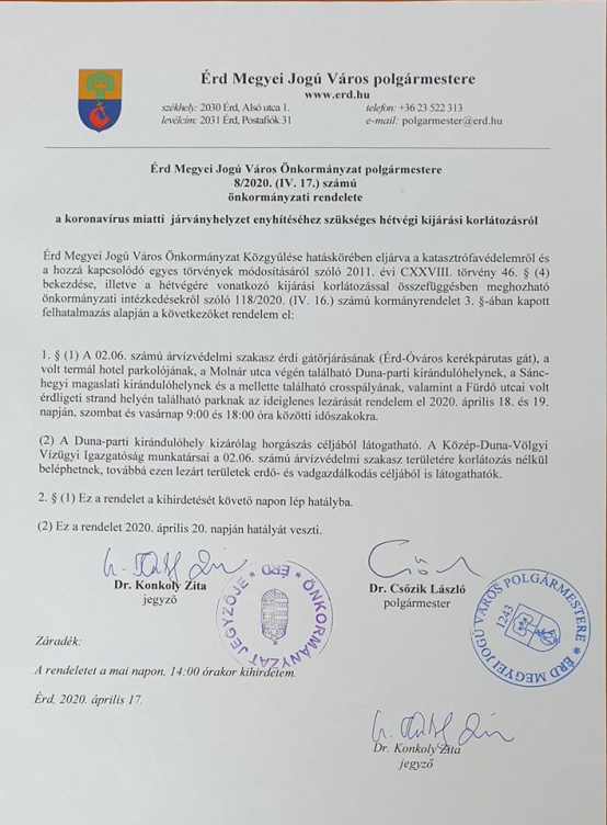 Amint azt a polgármester közösségi oldalán írja, a kormány a húsvéti tapasztalatok alapján a települések polgármestereire bízta az érvényben lévő kijárási korlátozások szigorítását a hétvégén. "(...) néhány helyen olyan tömegek gyűlnek össze ilyenkor, hogy lehetetlen tartani a normális és egészséges távolságot. A járvány továbbra is valós és halálos veszély, különösen a fővárosban és környékén – azt szeretném elérni, hogy Érden, amíg lehetséges, a lehető legkisebb mértékben terjedjen", ezért úgy döntött, hogy a hétvégén reggel 9:00 és este 18:00 között több kirándulóhely, park, gátszakasz látogatásának tiltását, illetve korlátozását rendeli el.
