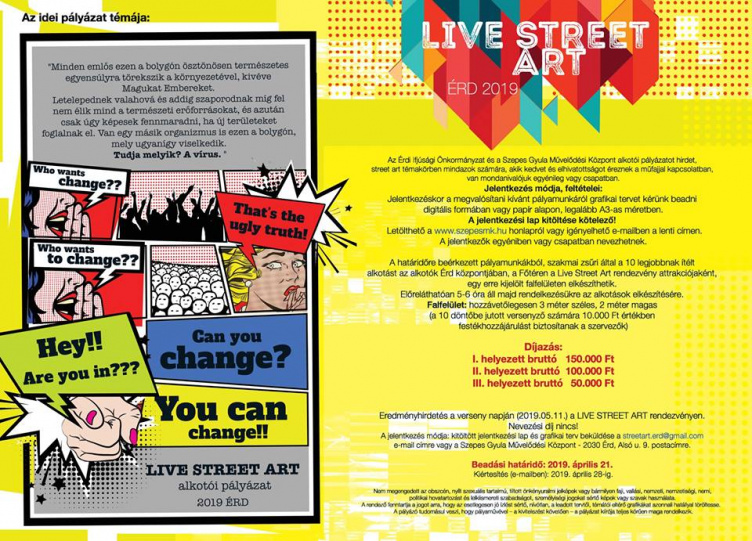 - A határidőre beérkezett pályamunkákból, szakmai zsűri által a 10 legjobbnak ítélt alkotást az alkotók Érd központjában, a Főtéren a Live Street Art rendezvény attrakciójaként, egy erre kijelölt falfelületen elkészíthetik. Előreláthatóan 5-6 óra áll majd rendelkezésükre az alkotások elkészítésére, 2019. május 11-én!