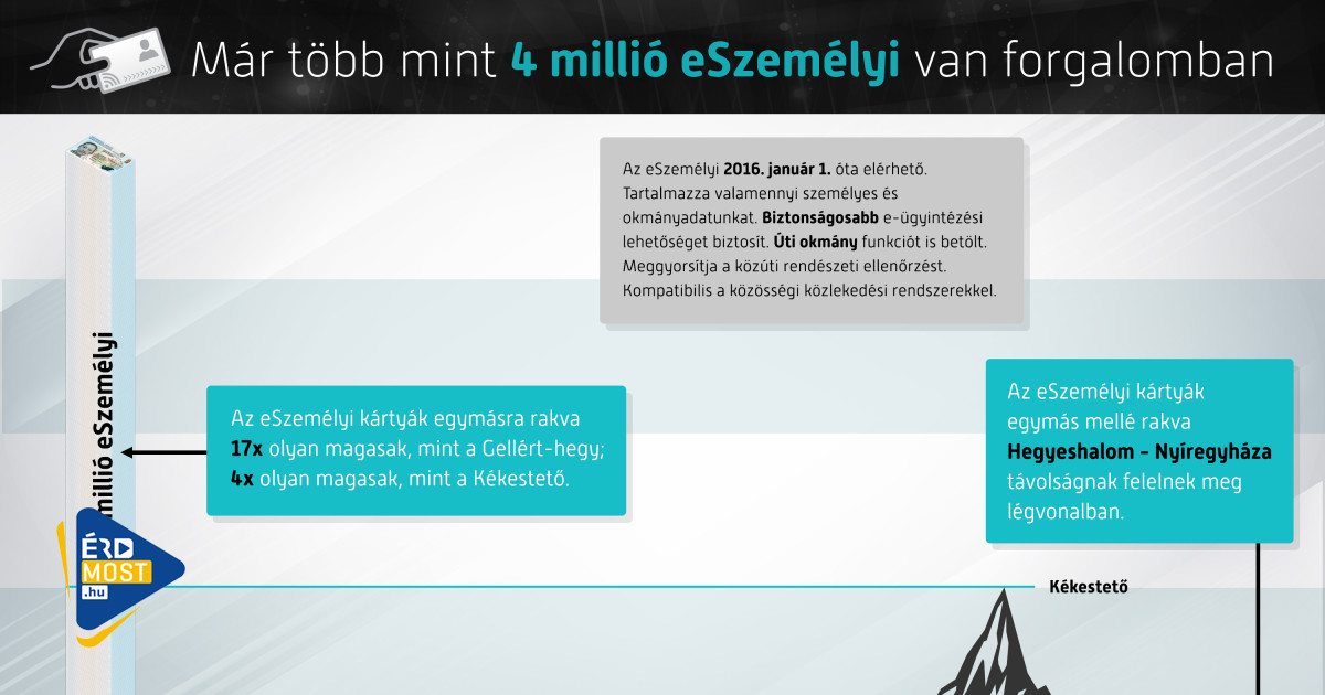 A 2016 –os bevezetéstől mindössze három év kellett, hogy a kiadott eSzemélyi okmányok száma meghaladja a 4 millió darabot. Az elektronikus chipet is tartalmazó személyazonosító igazolványok egymásra rakva közel négyszer olyan magasak lennének, mint a Kékestető, egymás mellé helyezve pedig légvonalban Hegyeshalomtól egészen Nyíregyházáig érnének el.