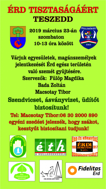 - Mindenki a saját környezetében is szedhet szemetet. Az a lényeg, hogy hívjon fel a megadott telefonszámon, és akármennyien is szedik az adott területen, viszünk oda zsákot és el is szállítjuk az összegyűjtött hulladékot. De már kialakult csoportokhoz is lehet csatlakozni, erről is tőlem tudnak informálódni az érdiek – hangsúlyozta Macsotay Tibor.