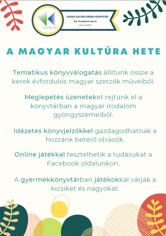 Mint a Csuka Zoltán Városi Könyvtár honlapján ismertették, a magyar kultúra hete alkalmából a kerek évfordulót ünneplő magyar szerzők műveiből készítenek tematikus könyvválogatást.