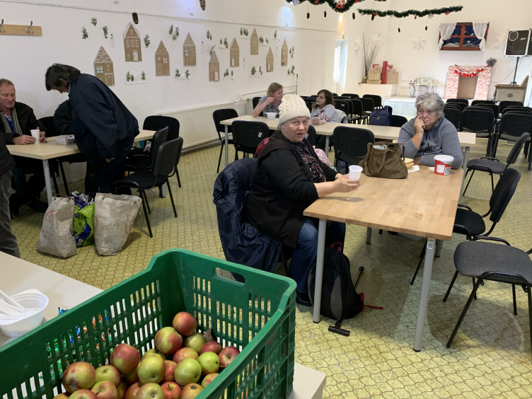 A Szociális Gondozó Központba érkezett ruhaadományokat is kiteszik az ételosztások során, így az ebédelni érkezők a ruhák közül is válogathatnak.