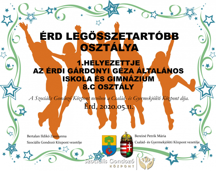 Idén az Érd Legösszetartóbb Osztálya cím és a vándorserleg az Érdi Gárdonyi Géza Általános Iskola és Gimnázium 8.c osztályát illeti, osztályfőnökük: Maár László Csabáné.