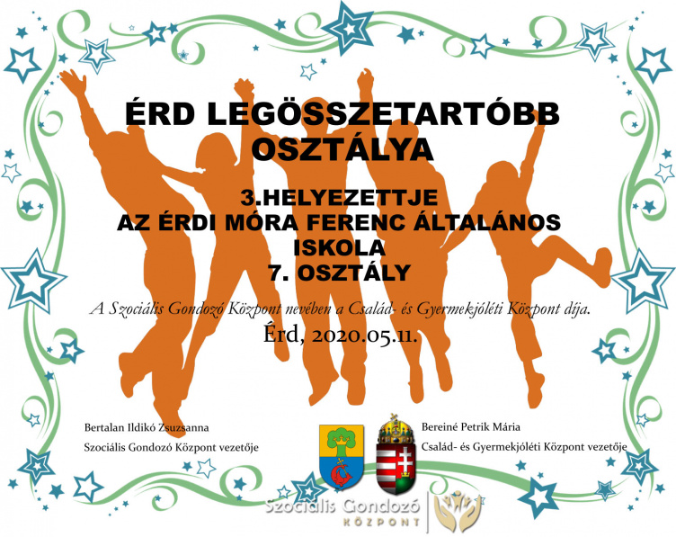 Az okleveleket a Szociális Gondozó Központ juttatja el az iskoláknak - a vándorserleggel nem lesz gond, mivel az a tavalyi nyertesnél marad, hiszen 2019-ben is a Gárdonyi ugyanezen osztálya lett az első. A nyertes osztályokat egy adományozónak köszönhetően meglepetés is várja: az első helyezett osztály 25 ezer, a második helyezett 15 ezer, a harmadik pedig 10 ezer forint pénzjutalomban is részesül.