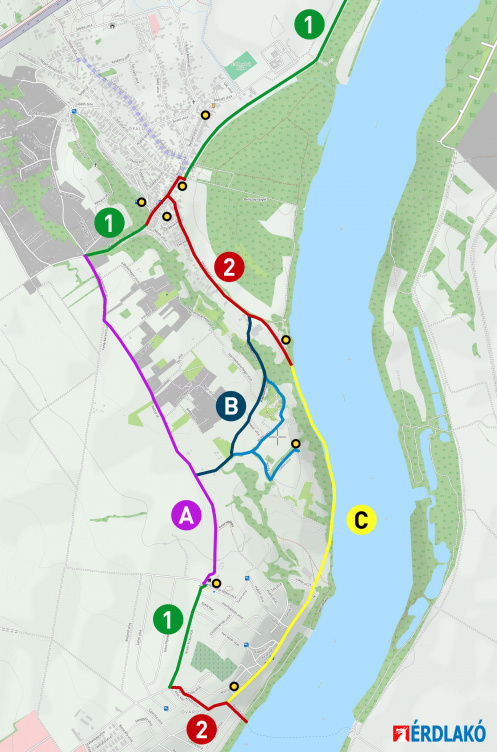 A 2013-ban készült döntéselőkészítő tanulmány eredetileg négy útvonalváltozatot készített az Eurovelo 6 érdi szakaszára, a későbbi elképzelések ezeket variálták. Számunkra az A és a C az érdekes.
