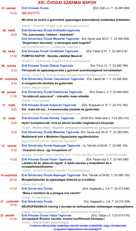 Mint Szilasné Mészáros Mártától, az Érdi Kincses Óvoda intézményvezetőjétől megtudtuk, a nyitott foglalkozások mellett a szakmai napok keretében három napos akkreditált továbbképzést is rendeznek, az érdi óvodák pedagógusainak. Ezt az önkormányzat finanszírozza, és térítésmentesen biztosítja az érdi óvó néniknek.