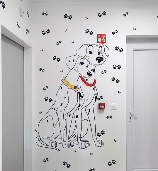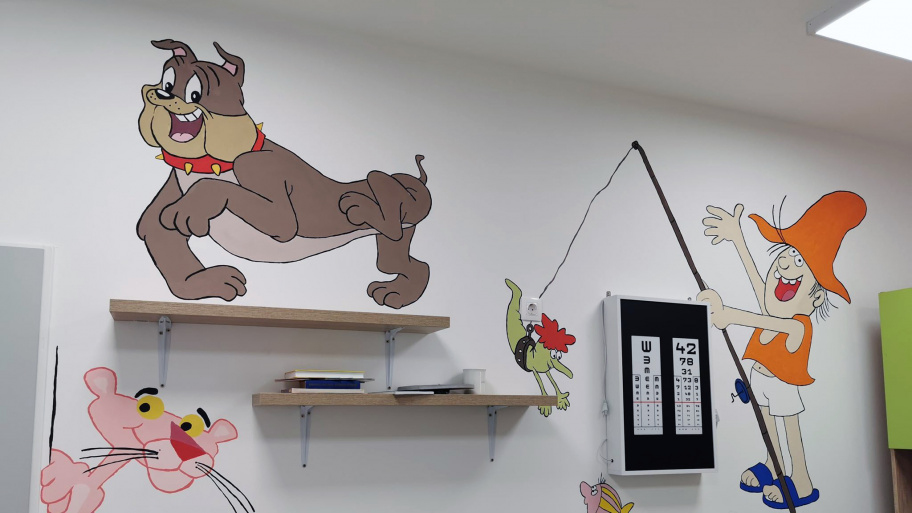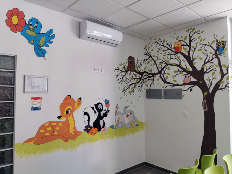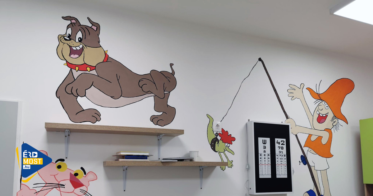 A jó kézügyesség sajnos nem minden szülő sajátja, de a rendelőfestés ötletgazdája, Karácsony-Varga Gabriella és az önkéntesek egy pofonegyszerű módszert alkalmaztak: projektorral a falra vetítették a mesefigurák rajzait, majd utánarajzolták a kontúrokat.