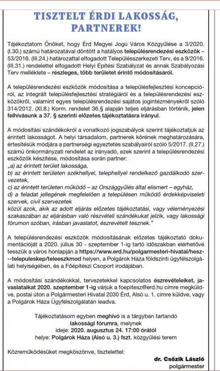 A módosítási szándékokkal, tervezetekkel kapcsolatos észrevételeket, javaslatokat szeptember 1-jéig várja a hivatal a foepitesz@erd.hu címen, valamint postai úton a Polgármesteri Hivatal 2030 Érd, Alsó u. 1. címre küldve, vagy a Polgárok Háza ügyfélszolgálatán leadva.