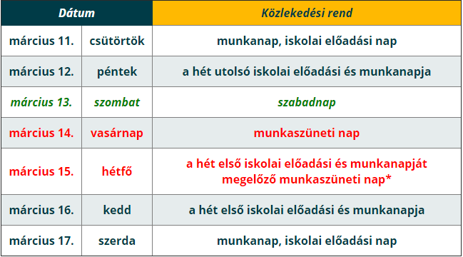 A Volánbusz honlapján részletezte a március 15-e körüli időszak közlekedési rendjét, melynek értelmében március 15-én, hétfőn a buszok vasárnapi menetrend szerint közlekednek.