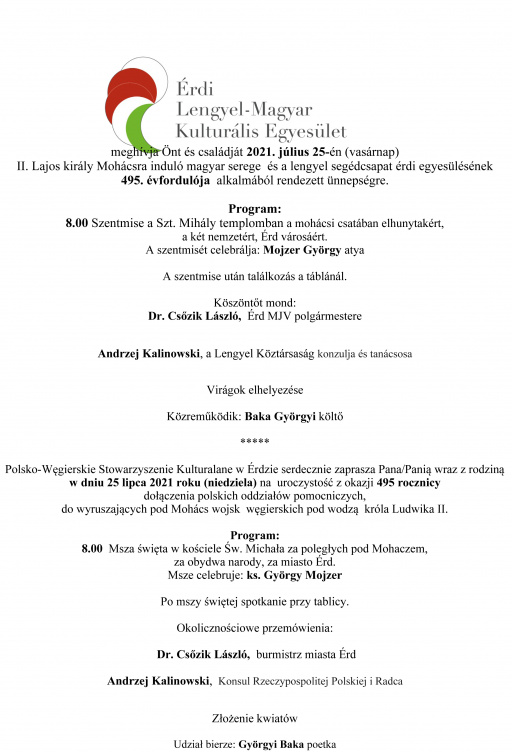 A mohácsi csatában elhunytakra emlékezünk minden esztendőben az Érdi Lengyel-Magyar Kulturális Egyesület szervezésében. Reggel 8 órakor az ófalusi Szent Mihály templomban tartanak szentmisét, majd az oroszlános emlékműnél Csőzik László olgármester, illetve Andrzej Kalinowski, a Lengyel Köztársaság konzulja és tanácsosa köszönti a megemlékezőket. Az ünnepségen közreműködik Baka Györgyi költő.