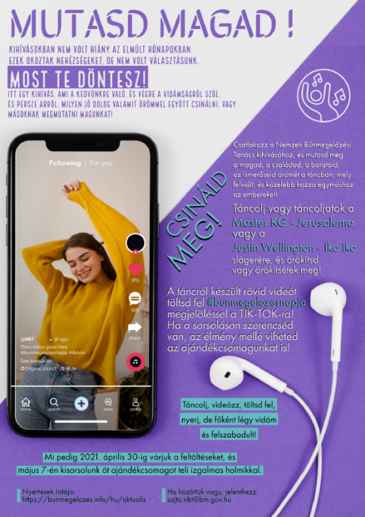 Vidám pályázatot hirdetett a Nemzeti Bűnmegelőzési Tanács, amely táncolásra és videózásra buzdítja a fiatalokat. Április 30-ig várják a feltöltéseket TIK-TOK-on #bunmegelozesnapja megjelöléssel. Május 7-én 5 ajándékcsomagot sorsolnak ki a győztesek között.
