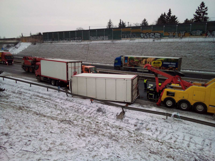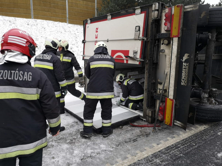Kamion, mikrobusz ami trélert vontatott, egy kisteherautó és egy pótkocsit vontató teherautó ütközött össze csütörtökön reggel az M0-ás autóút 8-as kilométerénél, Törökbálint közelében. Az ütközés következtében a pótkocsi az oldalára borult, forgalmi akadályt okozott. A törökbálinti hivatásos tűzoltók áramtalanították és átvizsgálták a járműveket, majd tűzoltódaru segítségével a felborult pótkocsit a kerekeire állították. A tűzoltók munkáját a Pest megyei katasztrófavédelmi műveleti szolgálat irányította. A műszaki mentés ideje alatt az érintett útszakaszt lezárták.