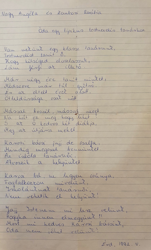 Mint lapunknak elmondta, az ófalusi iskolában szenzációs volt, hogy a pedagógusi kar fele férfi, fele nő volt és különösen jó dolog volt, hogy a szülők és a tantestület együttesen gondolkodott a pedagógiáról, ennek köszönhetően a gyermekeket nem kellett fegyelmezni.