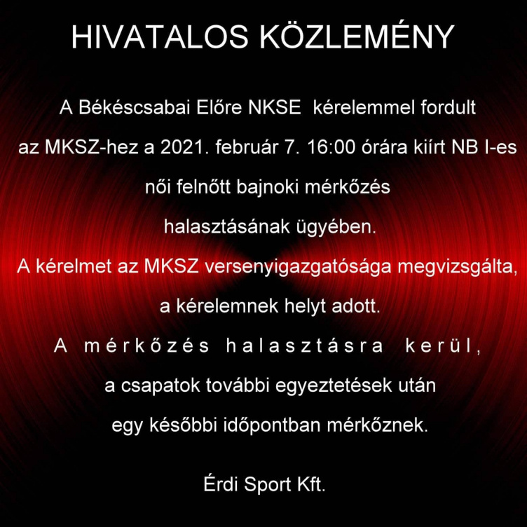 Elhalasztotta a Magyar Kézilabda Szövetség a 2021. február 7-én 16 órára kiírt ÉRD - EUbility Group-Békéscsabai ENKSE találkozót a női élvonalbeli kézilabda-bajnokság 10. fordulójából.