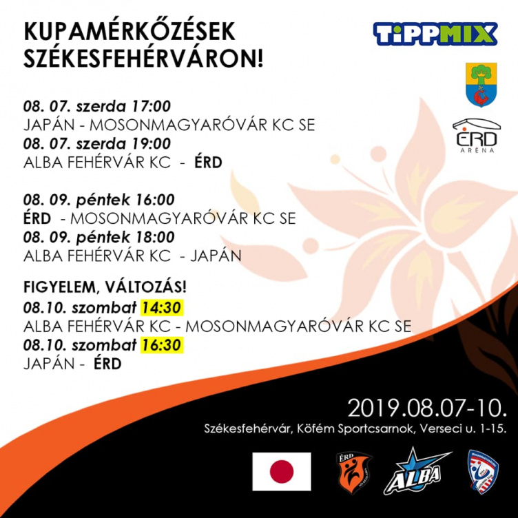Az ÉRD közösségi oldalán található beharangozó értelmében az augusztus 10-i, Japán válogatott elleni mérkőzése 16 óra helyett fél órával később, 16.30-kor kezdődik. A másik két nap programja nem változott: augusztus 7-én, szerdán, 19 órától a házigazda Alba Fehérvár KC-val, augusztus 9-én, pénteken pedig 16 órakor a Mosonmagyaróvári KC SE-vel játszanak Janurik Kingáék.